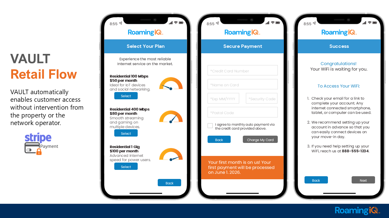 VAULT features powerful retail-based billing integrations. This allows residents to pay for the service directly through the portal, whether they cover the full cost or pay a subsidized cost-share rate defined by the property owner.